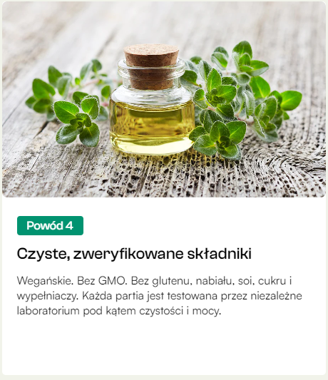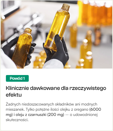 Każda kapsułka miękka łączy w sobie silnie działający olejek z oregano (6000 mg) z olejem z czarnuszki (200 mg) — dwa klinicznie przebadane składniki, znane ze swoich naturalnych właściwości antybakteryjnych, przeciwwirusowych i przeciwzapalnych.