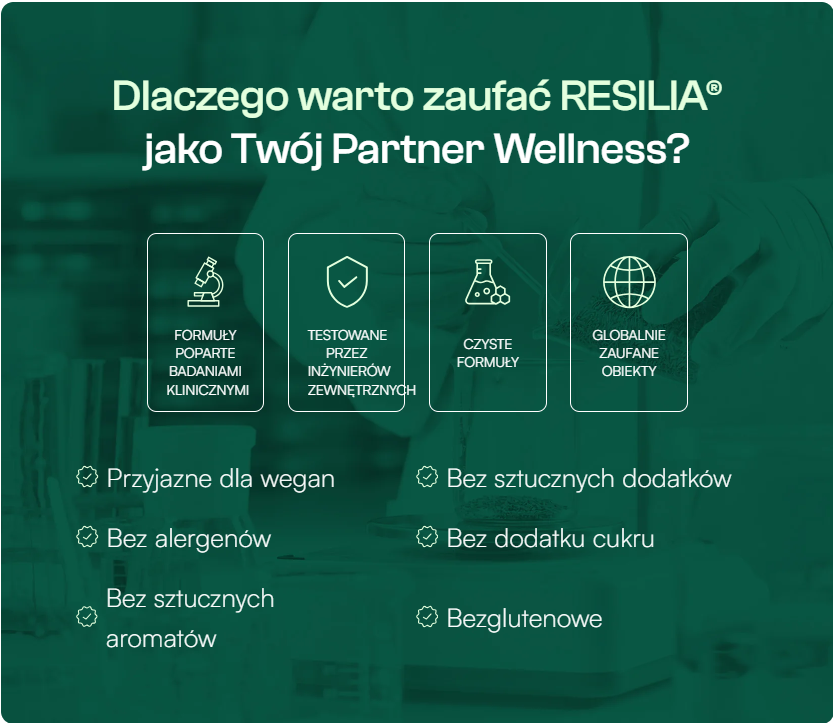 Twoje ciało zasługuje na coś więcej niż puste obietnice. Resilia® zapewnia realne, mierzalne rezultaty dzięki składnikom opracowanym na podstawie dziesięcioleci badań klinicznych.